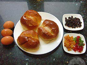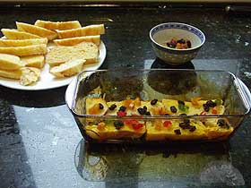 Hacía tiempo que descubrimos esta receta (como muchas veces fué una reelaboración de otra bastante distinta), pero no la hacíamos porque da para mucho y en casa entre solo 2 terminamos hartos de comerlo. Pero nos decidimos un día a repetirla, y redescubrimos lo riquísimo que sale, algo difícil de explicar lo sabroso y jugoso que queda este pudin, que a nada que tengas un poco de hambre te comes un montón: prueba a hacerla que te sorprenderá! ![]() Ingredientes: 3 bollos suizos Elaboración: Poner la leche al fuego suave con las especias y el azúcar, cuando comience a hervir retirar. Cortar las frutas en daditos pequeños del tamaño de las pasas más o menos,mezclándolas luego con las pasas. ![]() Derretir la mantequilla a baja potencia en el microondas. Si los suizos son de un día para otro es mejor. Cortarlos en laminas no muy finas e ir untándolos uno a uno con la mantequilla, dejándolos en un plato. ![]() ![]() Untamos un molde bien por dentro con el caramelo liquido, y vamos poniendo una capa de suizo, una parte de frutas y cubrirlo con otra capa de suizo, frutas y así tres veces, la capa final de suizos solo. ![]() ![]() ![]() ![]() Una vez un poco fría la leche la mezclamos con los huevos batidos, vertemos esto en el molde con lo anterior y dejamos reposar como un cuarto de hora. Meter en el horno (precalentado a unos 180º, calor normal) durante 40 minutos más o menos, o hasta que al pinchar no salga mojado. Dejar enfriar un poco (bajará bastante de altura) y desmoldar. ![]() Espero que tambien te parezca como a nosotros riquisimo, y que disfrutes lo mismo templado que frío del pudin de bollo suizo y de su relleno de pasas y frutas escarchadas. ![]() |