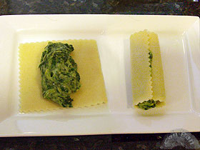 Ahora vamos rellenando las placas de pasta con la masa de espinacas preparada. Depositamos sobre cada una de ellas una cucharada o algo más y enrollamos.