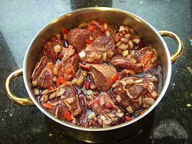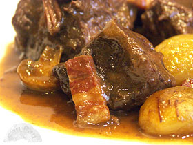 Presentamos una receta muy clásica de carne de vaca guisada. Aunque con el añadido de nuestros toques diferentes, como siempre, pero respetando bastante la receta original (buscada en páginas de cocina francesas, claro!). Una forma un poco diferente de comer la carne, pero que queda francamente rica: sabrosa, aromática y con una guarnición muy agradable. Y aunque hay muchas piezas que se pueden usar para guisar, nosotros hemos utilizado una carne muy especial, que ha dado un resultado fantástico (lee más abajo el truco). ![]() Ingredientes: 1,5 Kg carne de vaca Elaboración: Ante todo nuestro truco especial: hemos usado una carne sabrosa, tierna, jugosa... y que en ninguna receta usan para hacer guisada: carrilleras de añojo. Pruébala, así o en otros guisos que acostumbres a hacer, y verás! Por otro lado hemos hecho unos pocos cambios: preferimos usar chalotas en vez de cebollitas francesas como es lo original. Y la carne no la pasamos por harina, ni ésta la echamos después, pues la salsa engorda suficientemente y la harina no aporta nada. Finalmente, se ven muchas recetas con la carne hecha en cazuela cerrada al horno, durante varias horas. Nosotros hemos preferido hacerla en fuego eléctrico convencional, y nos ha llevado mucho tiempo pero ha quedado exquisita. Tú puedes hacerla en el horno o incluso en olla rápida para ahorrar tiempo, por supuesto. Después de limpiar la carne de grasa y zonas feas la cortamos en trozos grandes. En particular las carrilleras en 4 o 6, dependiendo de su tamaño. En una cazuela amplia ponemos la carne, la cebolla y las zanahorias picaditas, y el hatillo de aromáticos (laurel, tomillo, orégano, pimienta...). Cubrimos con el vino y el caldo de carne. ![]() Llevamos a ebullición y cocemos suavemente durante bastante tiempo, tapándolo cuando veamos que ha reducido el líquido hasta que se empieza a ver la carne (y salando al cabo de un par de horas). A nosotros nos ha llevado más de 5 horas hasta que ha quedado la carne bien tierna, pero como he dicho, puedes intentar hacerlo a presión durante unos 45 minutos, salando previamente, y luego reducir el caldo pues no se habrá consumido nada. Sacamos la carne y los aromáticos (estrujamos bien el hatillo para sacar todo el jugo que haya quedado dentro) y trituramos el resto. Debe quedar una salsita untosa. Volvemos a echar en la cazuela la carne y la cubrimos con dicha salsa. Mientras se hace la carne, iremos haciendo con tiempo las guarniciones. Por un lado, saltearemos en un poco de aceite las cebollitas o chalotas (bien peladas), hasta que estén tiernas (mejor tapadas y a fuego muy suave para que no se doren). No olvides salarlas también. Igualmente salteamos los champiñones limpios y cortados a la mitad (si son pequeños dejalos enteros), durante unos 10 minutos. Y finalmente, por otro lado, salteamos 10 minutos el bacon sin corteza y cortado en bastoncitos gordos, y escurrimos bien la grasa que suelte. Si fuera fresco le daríamos un hervor primero, pero nosotros hemos usado uno con un adobado suave, aunque se podría usar bacon ahumado igualmente. Una vez que tenemos todas las guarniciones hechas (y la carne, claro), las incorporamos a la cazuela y damos un hervor todo junto de 1/2 hora. (algunas recetas no juntan las guarniciones, y nos parece un error no dejar que aporten su sabor a la salsa, ni que cojan parte del sabor de la misma). Este plato es importante hacerlo el día anterior, pues con el reposo mejora notablemente (como muchos guisos). Así que al día siguiente recalentamos la cazuela suavemente, para disfrutar con nuestro especial boeuf bourgignon, y su combinación del gran sabor de la salsa y la carne y las diferentes texturas y sabores de las guarniciones. ![]() |