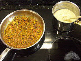 Otra receta de una tapa que se ve en muchos bares de nuestra geografía, y que podemos hacer fácilmente en casa (aunque lleva su tiempo, pero compensa). Y con la ventaja de que podemos congelar los que nos sobren, para más veces... Esta forma de rellenar los mejillones es bastante común, la principal diferencia según zonas es mezclar la bechamel con el relleno o simplemente cubrirlo con la misma. Aunque el nombre de Tigres ya es más dudoso, pues en algunos sitios llaman así a los mejillones en salsa de tomate picante. ![]() Ingredientes: 1 Kg. de mejillones nota: nosotros muchas veces utilizamos mejillones de los que vienen ya cocidos y envasados al vacío, con una o dos de las conchas. Así nos saltamos el primer paso de cocción, y -según cuales- hasta la limpieza previa, pues están suficientemente limpios. Elaboración: Lo primero será limpiar las conchas de los mejillones un poco, para quitarles las barbas pegadas y esas cascarillas blancas que tienen algunos, poniendo especial interés en las de los más grandes (calcula como la mitad), de forma de poder usarlas luego para el relleno. Una vez limpios los ponemos en una cazuela grande y abrimos los mejillones al vapor. O sea: tapados y con el vapor del agua que suelten ellos mismos. Podemos revolver cuando veamos que se empiezan a abrir para que se abran más por igual, y no hay que dejarlos mucho, lo justo hasta el momento que se abren todos (aunque no estén muy abiertos), para que no se resequen. Ya abiertos y un poco fríos separamos los mejillones y colamos el agua que hayan dejado, para usarla luego. ![]() Quitamos la carne de las conchas, cortando con un cuchillo bien afilado para que no quede nada de carne pegada en las mismas, y quitamos las barbas que estén en la carne, mirandolo bien. Como he dicho, nos quedaremos con la mitad de las conchas más o menos (unas 24-26). Como el tamaño puede variar, y estar más o menos llenos, calcularemos que para que vayan bien con el resto de ingredientes usaremos unos 250 gr. de carne limpia de mejillón. Picamos bien todas las verduras, y la teoría es picarlas muchísimo para que luego no se noten. Aunque aquí nuestro truco es cortarlas en media juliana muy fina (que no da mucho trabajo pero así se hacen más rápido) y luego pasarlas por el pasapuré en la rejilla gruesa, y quedan perfectas. Haremos la cebolla a fuego vivo en el aceite durante 1 minuto. Añadimos el vino y cuando se ha evaporado un poco incorporamos el resto de verduras. Dejaremos a fuego lento hasta que estén muy blandos, posiblemente más de 1 hora. Vamos añadiendo agua de los mejillones según se sequen, hasta un total de 100cc. ![]() ![]() Mientras tanto, vamos haciendo 1/3 de litro de salsa bechamel para croquetas, sustituyendo en la receta original unos 130 cc. de leche por agua de los mejillones. Este truco nos dará muchísimo más sabor a la bechamel. Una vez bien ablandadas las verduras, rectificamos de sal (estarán ya algo saladas al haber echado agua de los mejillones), añadimos la salsa de tomate y el pimentón, damos un hervor, y pasamos por el pasapurés grueso (si hace falta). Añadimos la carne de los mejillones muy picaditos, y damos un último hervor todo junto de 2-3 minutos. ![]() Finalmente incorporamos la bechamel y mezclamos muy bien. Retiramos del fuego y dejamos enfriar un rato. Rellenaremos los mejillones bastante colmados, sin dejar enfriar mucho la masa, y procurando que quede la superficie lisa. nota: al mezclarlo todo queda como una masa de croquetas, pero con muchísimo más relleno. A nosotros nos gusta más así y es más cómodo de preparar y de comer, pero como alternativa en algunos sitios ponen una cucharada del relleno en cada concha y luego se napa con la bechamel. El resto es exactamente igual: tú decides. ![]() Ya frescos pasaremos la fuente a la nevera, hasta que estén bien fríos del todo y podamos terminar de preparar nuestros tigres. Los pasamos por harina, huevo batido y pan rallado, exactamente igual que unas croquetas (pero solo por el lado de la masa, no por la concha). Ahora podríamos congelar los mejillones rellenos ya listos para freír: primero los ponemos en una bandeja separados, y los metemos en el congelador. Una vez duros los pasamos a una bolsa etiquetada, y los guardamos para otras veces (no hace falta descongelarlos para usarlos). A la hora de comer, freírlos en aceite bien caliente hasta que se doren, sacarlos poniéndolos en una fuente con papel de cocina, con el frito hacia abajo para que deje el exceso de aceite. Servir los tigres inmediatamente para comerlos bien calientes. ![]() |