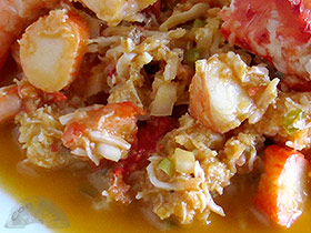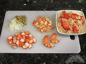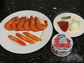 Esta es una receta de un tipo de ensalada muy diferente de los habituales salpicones. La salsa -muy especial- originalmente era para acompañar a un bogavante (o sea que para una ocasión especial tienes esta alternativa), pero nosotros la acompañamos con ingredientes más sencillos y económicos (aunque puedan no serlo, tú eliges). El resultado obtenido es muy gustoso, y asombra a los que lo prueban por primera vez. Ingredientes: 1 lata de cangrejo de 120 gr. Elaboración: El cangrejo puede ser normal, no de las más baratas que tienen un picadillo irreconocible, pero tampoco hace falta usar las latas caras de "Chatka" o similar, aunque si las usas por supuesto mejora. Sí es aconsejable por el contrario usar un aceite y vinagre de calidad, así como el pimiento del piquillo, pues le darán gran parte de la gracia a la salsa. Lo primero de todo será abrir la lata de cangrejo (previamente mantenida unas horas en la nevera) y dejar escurriendo bien el contenido sobre un colador. Trocearemoa el surimi y los langostinos (se puede dejar alguno entero para adornar, y si el cangrejo tenía trozos de pata también alguno) y se pone en un bol amplio con el cangrejo, una cucharada colmada de cebolla muy picada y el pepinillo igualmente picadito. Para hacer la salsa pondremos en el vaso de la batidora otra cucharada de cebolla troceada groseramente, el medio diente de ajo un poco picado, y el pimiento de piquillo. Añadimos el aceite, vinagre y sal. Trituramos bien con la batidora de brazo, que quede una crema uniforme, si la vemos demasiado espesa podemos aligerarla con una o dos cucharadas de agua fría. Ajustamos de sal y aceite o vinagre si vemos que alguno de estos ingredientes falta. Añadimos la salsa al bol, revolvemos bien, y dejamos en la nevera al menos 15 minutos, para que se integre y esté bien frío a la hora de comer. Servimos en platos y adornamos con el langostino y/o pata de cangrejo reservada y algo verde (aunque sea una hojita de perejil). Y a disfrutar de otra forma de comer marisco, muy sabrosa y diferente. Pruébala!