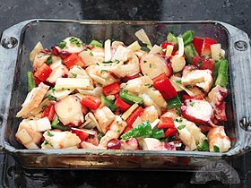 Una receta bastante clásica, que se puede ver -con muchas variantes- en bastantes bares, pero que me da la impresión de que a la gente le da pereza (o miedo) hacer en casa. Pero es bien fácil, si controlas las cantidades y las calidades de los ingredientes te saldrá algo para disfrutar mucho. Y además que cualquiera te agradecerá lo sabroso y fácil de comer... Ingredientes: 100 gr. de pulpo cocido Elaboración: Como la preparación no tiene mucho misterio, daremos primero unas indicaciones sobre los ingredientes: Evidentemente partiremos de pulpo del que venden ya cocido, bien al corte o bien envasado (que algunos de estos son excelentes). Lo cortaremos en rodajas no demasiado finas. No hace falta que sean patas muy gruesas, y si lo son igual tendrás que cortar las rodajas en 2 para que sean más fáciles de comer. Los langostinos (que podrían ser gambas) ya lo dejo a tu gusto: desde unos vivos y bien cocidos en casa (y dejados enfriar bien), hasta congelados cocidos, si son de calidad, valen. Los cortaremos en 3 o 4 trozos. En cuanto a las verduras es importante poder contar con pimiento rojo italiano, más sabroso que el pimiento morrón que es muy habitual, pero si no tienes... pon el que pilles. Lo que sí es importante es el uso de cebolleta en vez de cebolla, pues ésta deja más fuerte y basta la vinagreta. Se pican pero no demasiado pequeñas, que se noten los trozos. Las cantidades dadas son de las verduras ya limpias, por supuesto. Por último hablaremos del aliño: para la vinagreta usaremos un buen aceite de oliva virgen, sabroso pero sin pasarse, que hay algunos que dominan demasiado. En cuanto al vinagre, el de jerez le da muy rico sabor, pero es más fuerte y por eso mezclaremos a partes iguales con vinagre de sidra o de manzana. En cuanto a las cantidades totales no las doy pues serán bastantes, pero depende de gustos y del recipiente usado. Simplemente tener en cuenta de echar doble cantidad de aceite que de vinagre, que cubra a nuestro gusto. Opcionalmente podemos aromatizar con un chorrito de algún vino aromático: manzanilla o fino de Jerez puede ser. No olvidar añadir también un poco de perejil picado, salar adecuadamente, y revolver bien todo junto. Lo meteremos en la nevera al menos 1 hora antes de consumir, por un lado para que el salpicón de marisco esté bien frío y por otro para que se integren los sabores de las verduras. Y a disfrutar, servido en el plato o pinchado directamente de la fuente ;) |