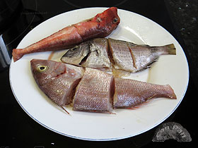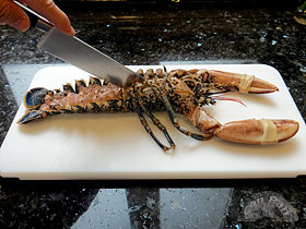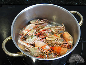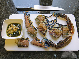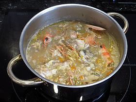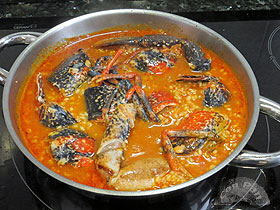 Hasta hace poco, cuando veíamos en un restaurante este plato, nos escandalizábamos: por el precio y por el aparente desperdicio de bogavante. Pero lo probamos una vez y nos sorprendió por lo rico, así que hemos repetido más veces. Esta elaboración que presentamos sigue la técnica mediterránea más que la gallega (que quizás es más habitual). Su acabado es rojo y meloso, con un sabor potente a marisco. ![]() Ingredientes: 1 bogavante hembra de 1/2 Kg. Elaboración: Con tiempo prepararemos el fondo de pescado y marisco, que incluso podemos hacer otro día y guardar congelado. Un ingrediente interesante para éste fondo son las cabezas de marisco: nosotros ésta vez las hemos aprovechado de unas cigalitas vivas hechas a la plancha, que hemos comido de aperitivo. Por otro lado unos pescaditos pequeños que siempre se pueden pillar a muy buen precio le añadirán mucho sabor.