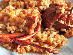 Sobre el aceite echamos el arroz, le damos una vuelta, y añadimos la salsa de tomate con la pulpa de pimiento bien triturada. Revolvemos para que se impregne bien el arroz con el tomate y pimiento, y añadimos casi todo el caldo bien caliente. Por último incorporamos los interiores que habíamos guardado del bogavante, bien triturados para que se incorporen al caldo. ![]() Llevamos a ebullición y mantendremos durante 16-17 minutos a fuego medio. A los 6 minutos incorporamos los trozos de bogavante con la carne hacia abajo. ![]()
