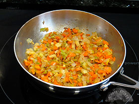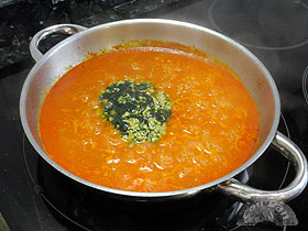 Aparte del pescado y marisco necesitamos un buen sofrito: hay que picar las verduras en brunoise (o sea en cuadraditos bastante pequeños), y hacerlas en 1 cucharada sopera de aceite durante 20 minutos, a fuego medio. Se tienen que dorar, así que el fuego no debe estar suave, y hay que menear a menudo para que no se requeme demasiado. ![]() En una cazuela honda salteamos las cabezas de marisco un rato, hasta que cojan buen color, y las machacamos un poco para que suelten bien todo su sabor. Añadimos a las verduras y completamos con 1 litro de agua, recogiendo bien lo que haya quedado en la sartén. Salamos, añadimos el pescado limpio y troceado, y llevamos a ebullición. ![]() Mantendremos a fuego más bien vivo durante 20 minutos. Una vez cocido corregimos el punto de sal, y pasamos el líquido contenido a un bol, escurriéndolo bien y colándolo si hiciera falta para eliminar todos las posos que puedan quedar. Posiblemente sobrará algo del medio litro que necesitamos, que podemos guardar para otros usos. Por otro lado metereremos durante 1 hora el bogavante en el congelador, para que se atonte y ni a él ni a nosotros nos duela tanto matarlo. Para matarlo lo ponemos en una tabla con el vientre hacia arriba y le clavamos el cuchillo en la cabeza, entre las patas. Luego terminamos de cortarlo en dos. ![]() Una vez cortado retiramos la bolsa de la boca, y sacamos a un bol el higado, las huevas y todo el agua que vaya soltando. Terminamos haciendo más trozos para que sea más manejable, y le damos un corte en la parte grande de la pinza para que se haga mejor y suelte su sabor. ![]() Ponemos una tartera o paella pequeña a calentar un par de cucharadas de aceite. Salteamos el bogavante troceado, hasta que coja color y lo retiramos. ![]()