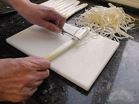 Después de lavar los espárragos un poquito para quitar la tierra que pueda quedar los pelamos de la forma habitual, usando un pelapatatas y pelando desde unos pocos cm. de la punta hasta el final del tallo (así quitaremos más de la zona más fibrosa del final). Si hace falta los repasamos hasta ver que hemos quitado toda la fibra (que se nota pues tiene un tono nacarado distinto).