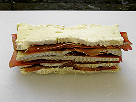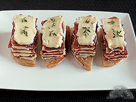 Partiendo de una de las chacinas más típicas y sabrosas de nuestro país, que si es de calidad (a poder ser con D.O. de León) es exquisita, y maridándola con un queso francés, pero que le va muy bien como contrapunto de la fuerza que pueda tener, hemos preparado unos pinchos riquísimos, sin mucho trabajo pero con mucho sabor. ![]() Ingredientes: un queso Camembert Elaboración: Como digo es importante que sea una cecina sabrosa, con ese toquecito ahumado tan característico, con un punto intermedio de curación, y que esté cortada muy fina para que sea fácil de comer. Por supuesto limpia de grasas y restos de suciedad de la piel. La tendremos a temperatura ambiente para el montaje, cortándola en trozos regulares del formato adecuado al tamaño del queso. Por otro lado el queso estará en el congelador 2 horas, para que al cortar no se aplaste. Le recortamos un poco por los laterales para que el corte sea de longitud uniforme, luego por la mitad, y de cada mitad sacamos 5 lonchas bastante finas. Nos sobrarán las esquinas que podremos comer otro día solas. ![]() Finalmente necesitaremos un aceite de calidad, que si tenemos tiempo tendremos aromatizando con una ramita de tomillo o romero durante unas horas. Con dicho aceite untamos ligeramente la cecina antes de hacer el montaje. Prepararemos un par de milhojas con 4 capas de queso, un toque de pimienta negra recién molida y la cecina, y finalizando con otra loncha de queso. Adornamos con unos trocitos del romero o tomillo usados para aromatizar el aceite. ![]() Cada torre la cortamos en dos, y cada mitad la colocaremos sobre un trozos de pan ligeramente tostado. En nuestro caso usamos una fina rebanada de pan de espelta cortada en 4. Aunque dependiendo del uso que le vayas a dar puedes cortar en más partes, para hacer pintxos más de bocado. Finalmente indicar que debe comerse a temperatura ambiente, aunque puedes probar incluso a pasarlo un poco por el horno para que se funda ligeramente el queso. Delicioso! ![]() |