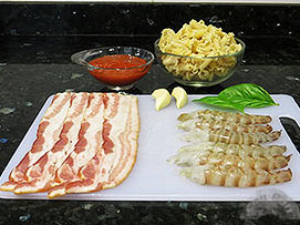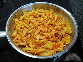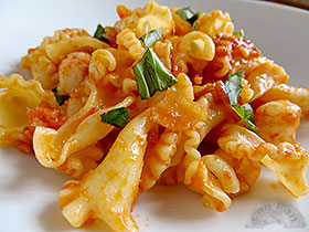 Entre las múltiples posibilidades que existen para combinar la pasta, nosotros siempre intentamos probar cosas nuevas. En éste caso una combinación de una pasta corta de formato muy original (gigli), que coge un sabor muy potente de la combinación mar y tierra que proponemos. ![]() Ingredientes: 125 gr. de pasta Gigli Elaboración: En una sarten amplia ponemos unas dos cucharadas de aceite y echamos el ajo muy picado (se puede hacer con los aparatos que hay para picar ajos, que utilizo por comodidad y me gusta el acabado). Doramos un poco el ajo pero con la temperatura muy baja. ![]() Mientras tanto ponemos al fuego una cazuela con abundante agua y sal, cuando empieza a hervir echamos la pasta a cocer, dejando el tiempo que aconseje según el paquete de la misma. En la sartén donde tenemos los ajos incorporamos el bacón cortado en tiras a lo ancho (luego se romperá y quedarán trozos) subiendo un poco la temperatura para que se dore un poco. A continuación incorporamos los langostinos cortados en trocitos no muy pequeños, al de un par de minutos ya estarán cogiendo color los langostinos e incorporamos el tomate dando unas vueltas, pero sin dejar demasiado tiempo para que no se reseque. ![]() Si la pasta está ya hecha es el momento de incorporarla a la sartén con el resto de ingredientes, dándole una vueltas para que se integre y coja bien la salsa. ![]()