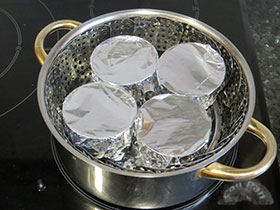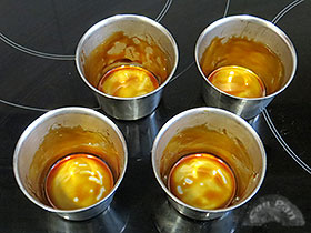 Después de haber hecho unos riquísimos pasteles rusos, nos quedaban las yemas para gastar. Y qué mejor que emplearlas en este exquisito dulce, típico de muchos sitios. Con las yemas usadas sale poca cantidad, pero merece la pena probar a hacerlo, pues no da mucho trabajo y el resultado está francamente rico. ![]() Ingredientes: 4 yemas de huevo (medianos) Elaboración: Para esta receta conviene partir de huevos muy frescos y de calidad, si son camperos y/o ecológicos mejor, dado que el sabor del resultado dependerá exclusivamente de la calidad de los mismos. Tendremos las yemas separadas de las claras (que usamos para otra elaboración), aunque no importa que vaya algo de clara con las mismas. Pondremos a calentar el agua con el azúcar a fuego medio (aromatizando si queremos con un trocito de vaina de vainilla o una tira de corteza de naranja), hasta que de un hervor. Dejamos templar a 50 ºC o menos. Mezclamos las yemas con la varilla, a mano y no con batidora, pues no conviene que salga espuma. Agregamos el almíbar colado poco a poco, mientras seguimos mezclando. ![]() Es muy importante que no quede ningún grumo o parte de diferente textura del huevo, así que colaremos 2 veces el batido anterior, con un colador lo más fino posible. Preparamos las flaneras untándolas hasta media altura con un poquito de caramelo líquido (lo más cómodo, si tienes) y extendiendo con el dedo. Aunque si no tienes, puede ser también un almíbar bastante espeso que hagamos, no hace falta que coja color. Repartimos equitativamente las yemas azucaradas. ![]() ![]() Cubrimos cada flanera con un trozo de papel de aluminio, cerrándolas bien para que no nos entre agua al hervir. Las colocamos en una cazuela pero no directamente en el fondo: nosotros hemos usado un soporte de los que se usan para hacer al vapor. Ahora echamos agua hasta que alcance una altura suficiente, de unos 2-3 cm. de la flanera, y ponemos a calentar con la cazuela tapada. ![]() Una vez que comienza a hervir el agua, bajamos el fuego para mantener el hervor al mínimo, controlando a menudo para que no hierva fuerte ni pare el hervor. las dejaremos hacer (siempre con la cazuela tapada y casi sin hervir) durante 15 minutos. Pasado el tiempo retiramos las flaneras de la cazuela y las dejamos enfriar. Una vez frías podemos pasar los tocinos de cielo a la nevera hasta el momento de comer, pues conviene comerlos frescos (aparte de que el huevo puede estropearse fácilmente). Se desmoldan con cuidado dando golpecitos en la flanera para que se suelten, y se pueden poner directamente en platos o colocar sobre un molde de madalena para que estén más decorativos. Y ya tenemos los tocinos de cielo terminados, para comer los que quieras... aunque ten en cuenta que cada uno corresponde a una yema de huevo, así que llenan bastante. ![]() |